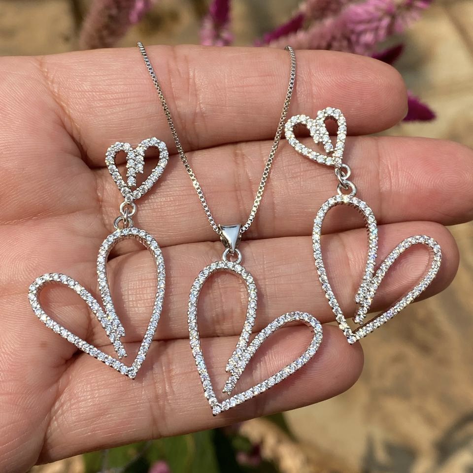 Conjunto prata coração vazado cravejado